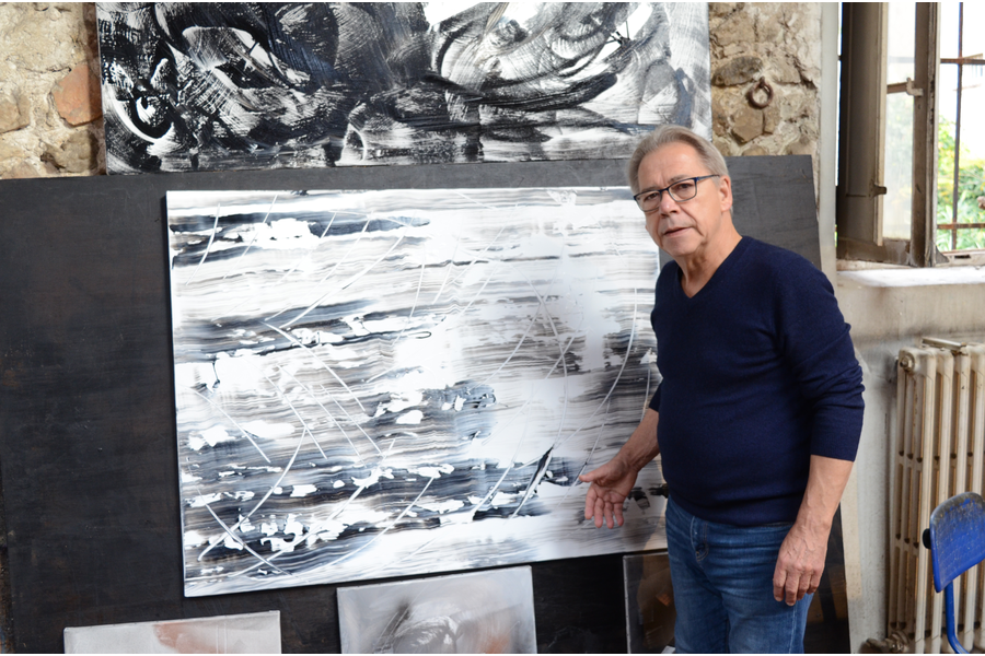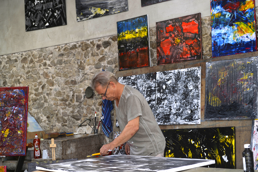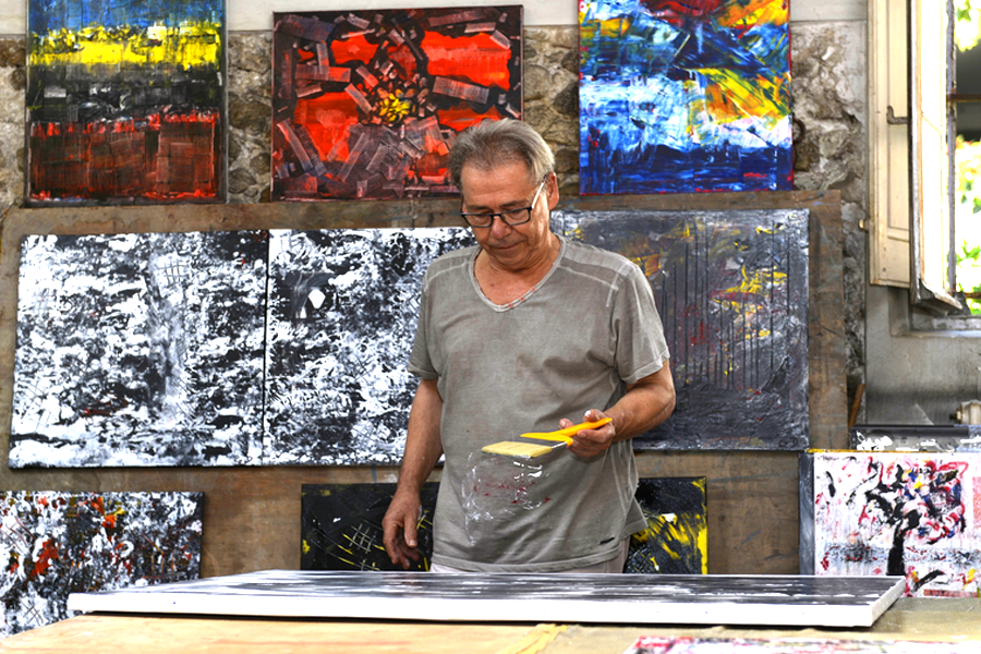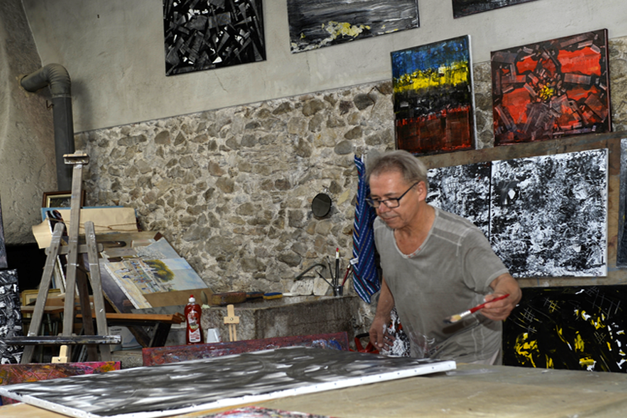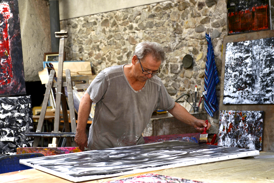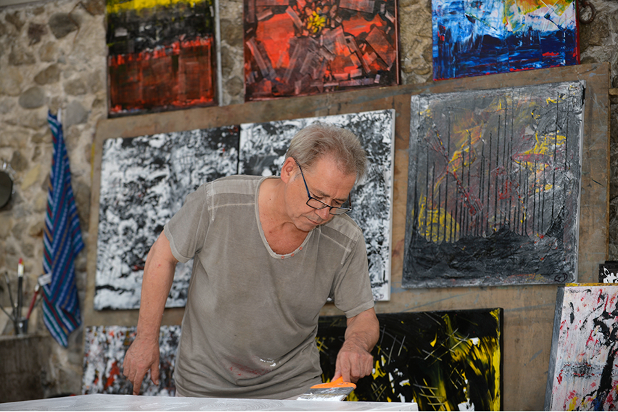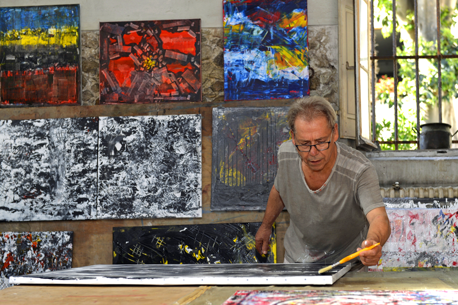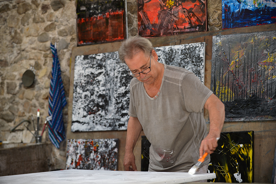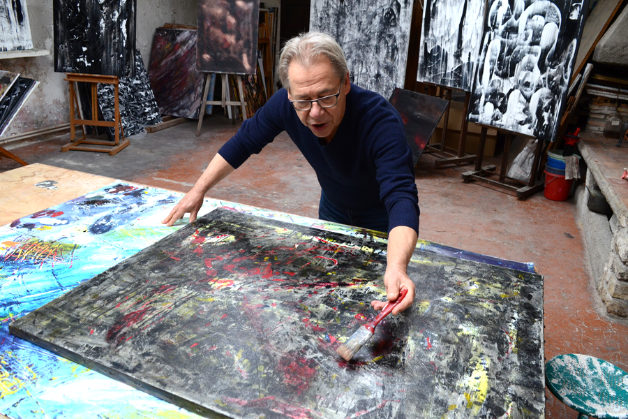 Après les mots, les traits et la couleur. Suite aux attentats du 13 novembre 2015, il devient nécessaire pour lui d’exprimer un autre ressenti. Conjointement à sa mise en scène du 3ème chapitre des PIECES DE GUERRE d’Edward BOND, « GRANDE PAIX », il poursuit sa création à travers une série de toiles.